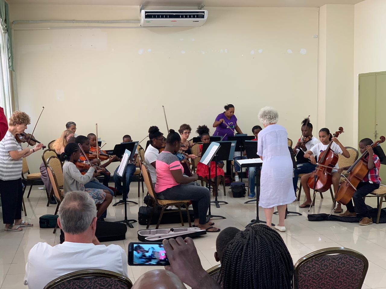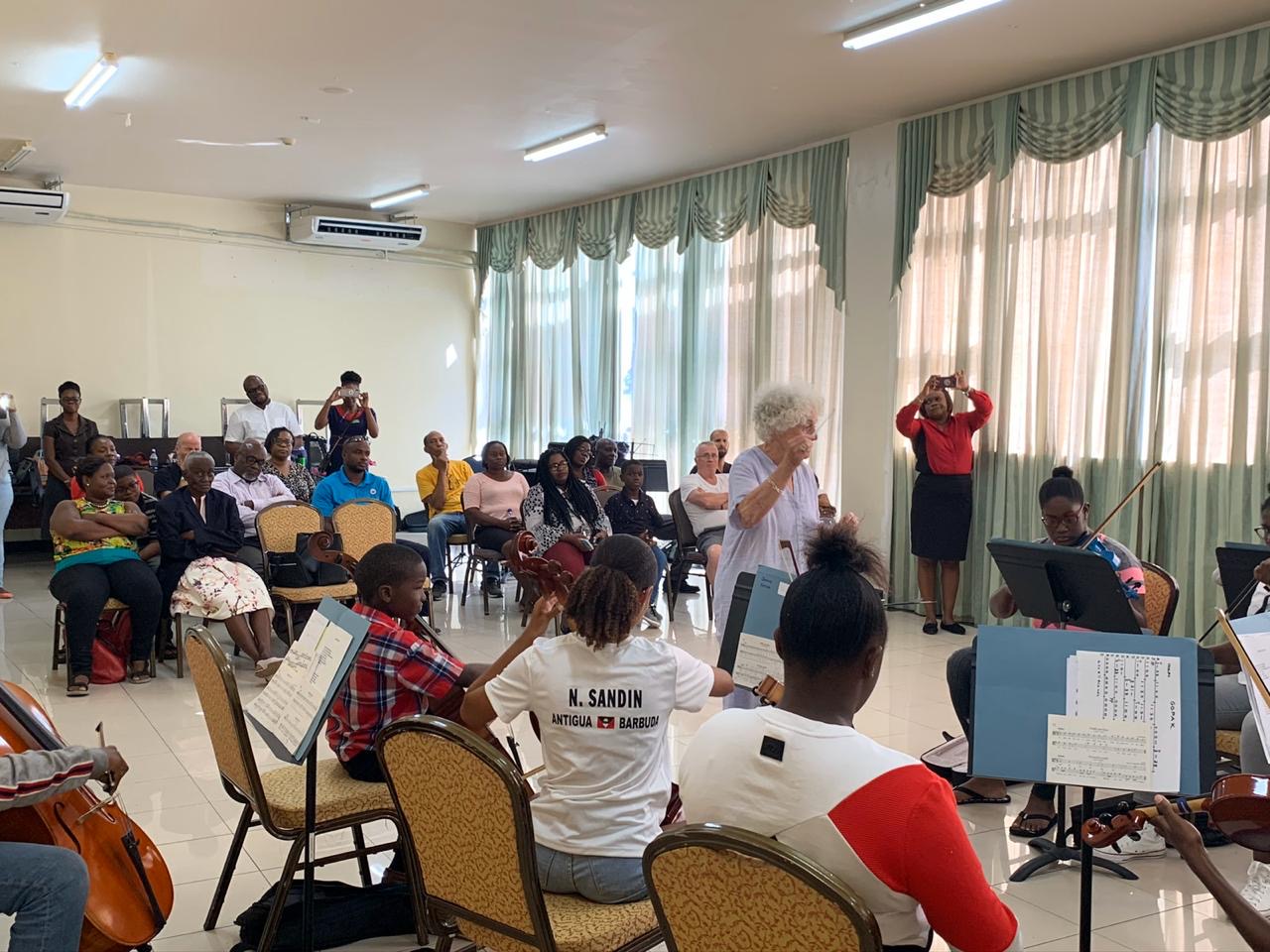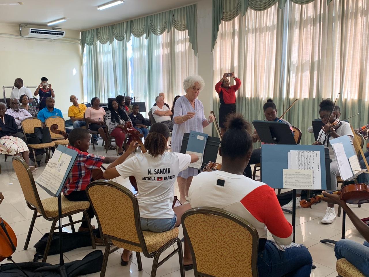 Eighteen young string players all under the age of 11 participated in the workshops which were held at the Sir Vivian Richards Cricket Stadium. Wendy and Cecily held a recital for parents at the end of the workshop where the children showed off their newly acquired skills. Wendy encouraged the ABYSO to invest in very young players ensuring they are taught correct technique from the onset. She also expressed her wish to work with local tutors and those interested in teaching to share skills she has picked up as a teacher over the years. Local pianist Shannon O’Garro ably supported the workshops as the volunteer accompanist.