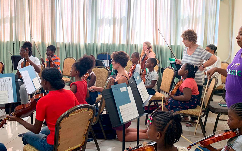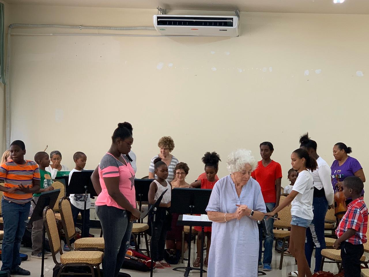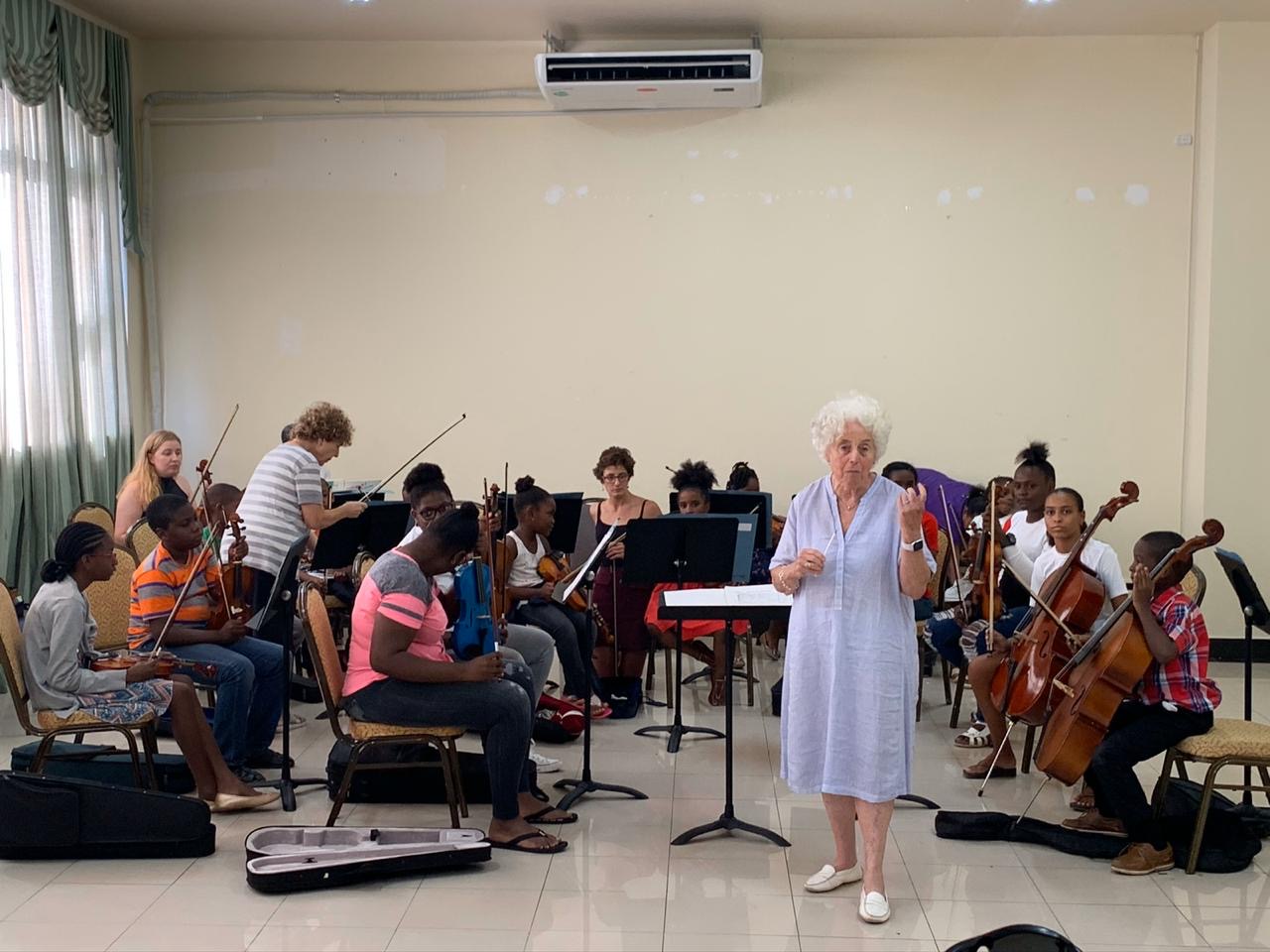 Eighteen young string players all under the age of 11 participated in the workshops which were held at the Sir Vivian Richards Cricket Stadium. Wendy and Cecily held a recital for parents at the end of the workshop where the children showed off their newly acquired skills. Wendy encouraged the ABYSO to invest in very young players ensuring they are taught correct technique from the onset. She also expressed her wish to work with local tutors and those interested in teaching to share skills she has picked up as a teacher over the years. Local pianist Shannon O’Garro ably supported the workshops as the volunteer accompanist.